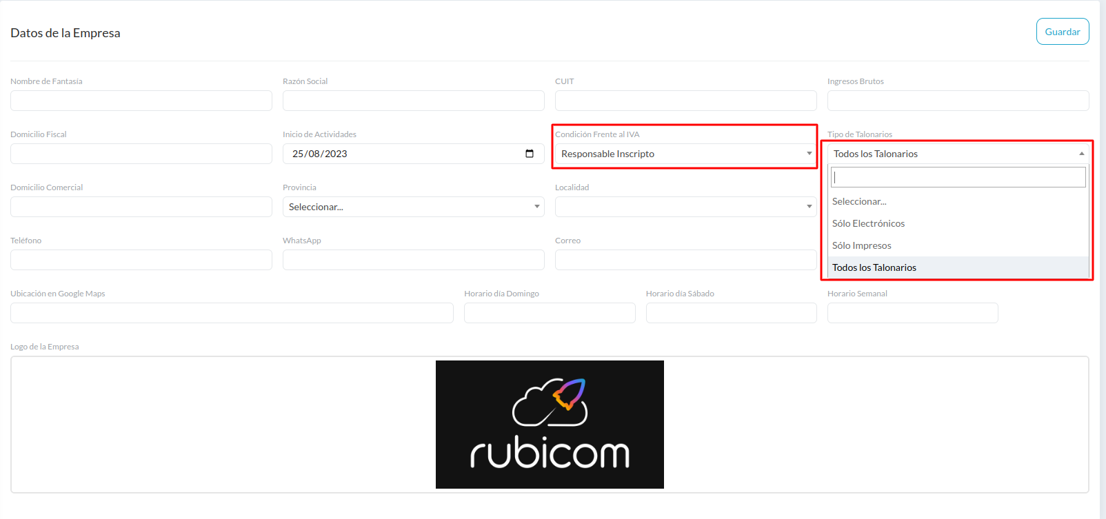 Ir a Condición Frente al IVA y seleccionar un Tipo de Talonario.