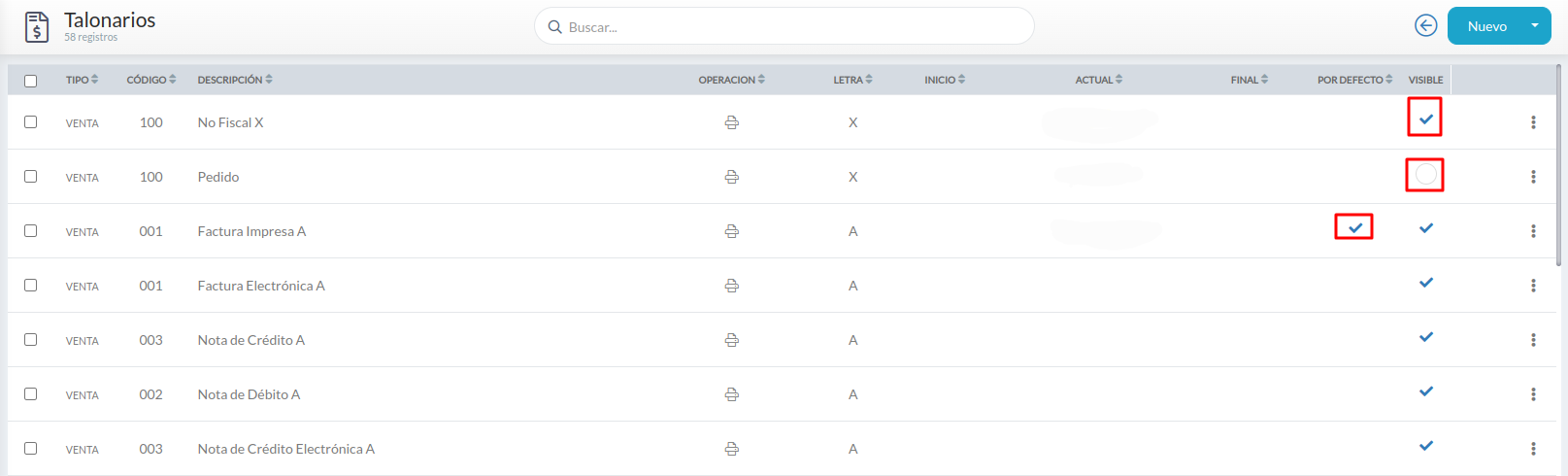 Ahora hacé click en visible en los talonarios que vas a usar.